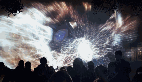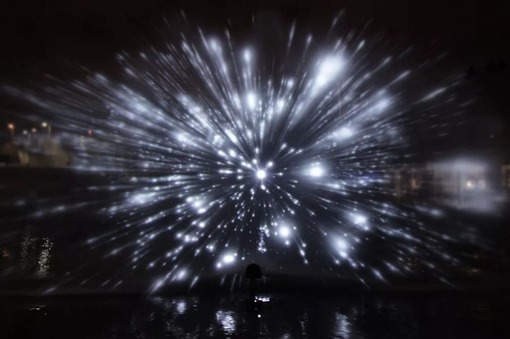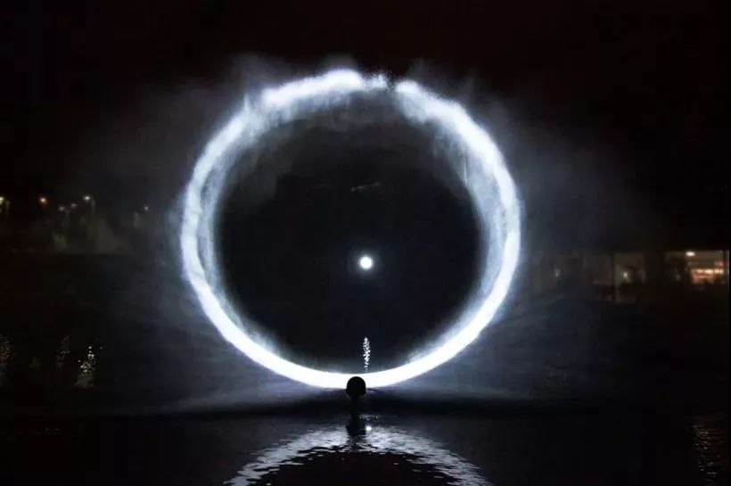 當(dāng)夜幕降臨之時,Constellations將三維燈光投射到水中,使它具有波紋的全息效果,結(jié)合電子音樂在空氣中形成不同的形狀和結(jié)構(gòu),光線映射在在水粒子表面,反射出發(fā)光的幾何圖形和各類球體,而這些是Joanie通過Constellations對宇宙的具現(xiàn),星空下那些閃閃發(fā)光的行星以及點線組合的不規(guī)則形體,在Constellations呈現(xiàn)出宇宙的星空的魅力。