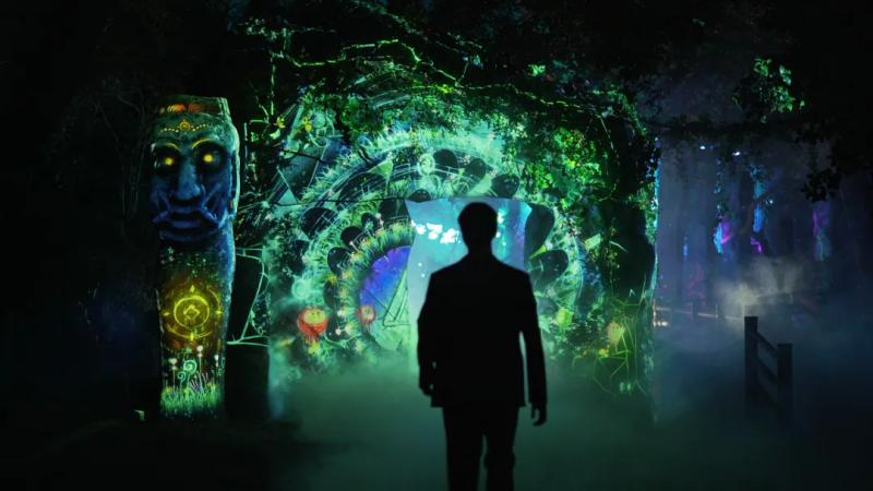 首先游客需要通過一扇已經遺忘的古老的大門進入DPIRANG的世界,神秘的雕像、魔法元素與藤蔓元素一起構成這扇神秘的大門,當大門被打開時一片閃閃發光的森林出現在眼前,古老的山茶花樹散發出新的生命氣息,紫光的綠藤樹和閃爍著光芒的樹圍繞在以光網為主題的激光門周圍,再往前走還有自然的流水巖石,數字投影形成的瀑布,而這也是園內最大的藝術空間裝置,以統營市著名藝術家的作品為藍本創作的,繼續走下去還會有更多奇幻的沉浸體驗。