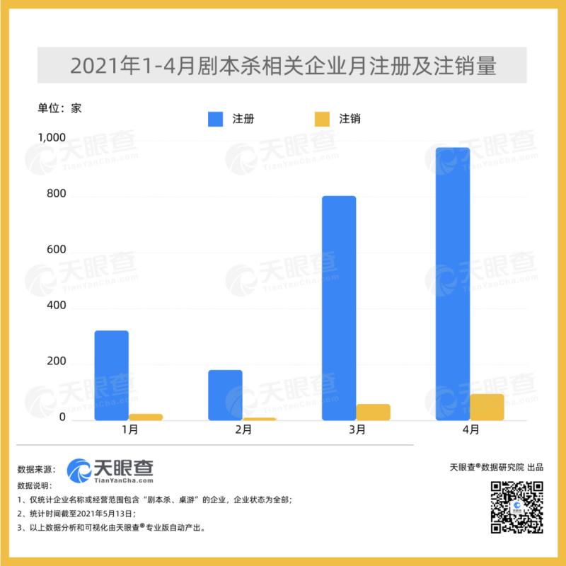 根據天眼查數據顯示,目前國內有超過6500家名稱和經營范圍包含“劇本殺”的企業,這還只是企業,據美團數據顯示,截至2020年年底,劇本殺線下門店已突破3萬家,而在四月份閑置平臺數據顯示,四月平臺上以“倒閉了”為理由轉賣劇本、道具、門店桌椅等劇本殺商品的數量較上月增長了110%,是上個月的兩倍之多,截至5月13日,我國今年已注銷近200家劇本殺相關企業。其中,4月共注銷近100家相關企業,環比增長102%。甚至整個數據還在繼續增長,廝殺仍在繼續,越來越多的尾部門店開始被動清場。