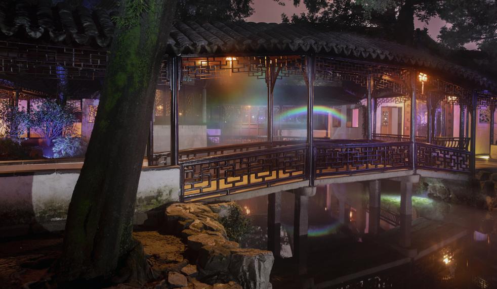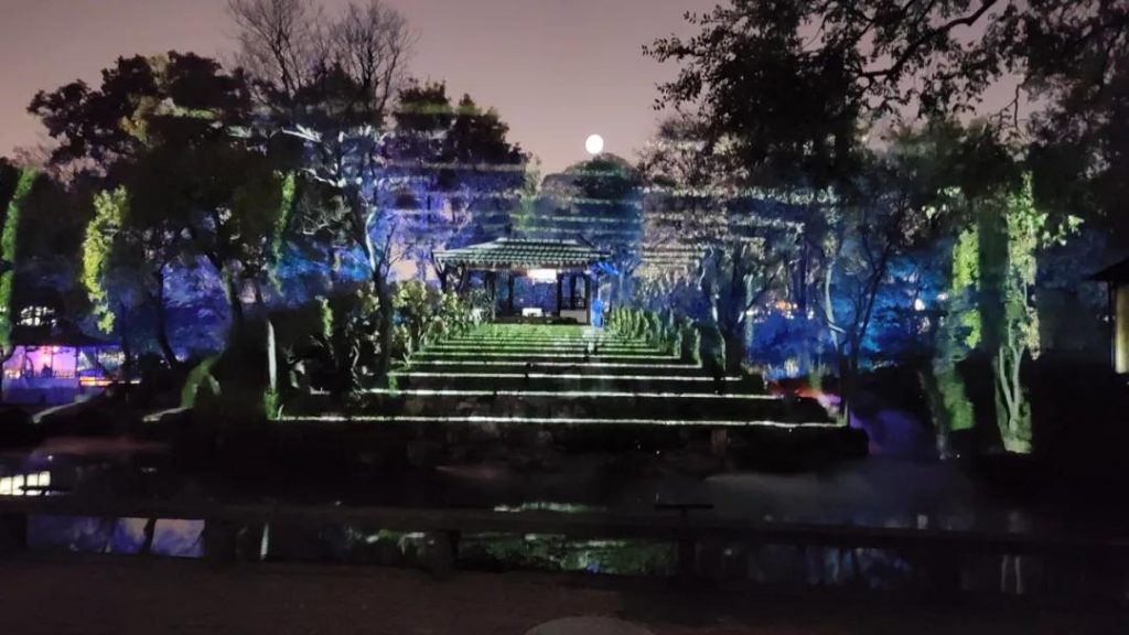 這是一個在夜間展示的全新的拙政園,用聲音、光影技術(shù)去理解和構(gòu)造古典傳統(tǒng)的園林美學(xué),也是一個時(shí)間與空間多重交互的感知現(xiàn)場,對觀眾游客不僅僅只是視覺沖擊的驚嘆,更有意去引導(dǎo)他們?nèi)ニ伎紙@林的文化藝術(shù)。