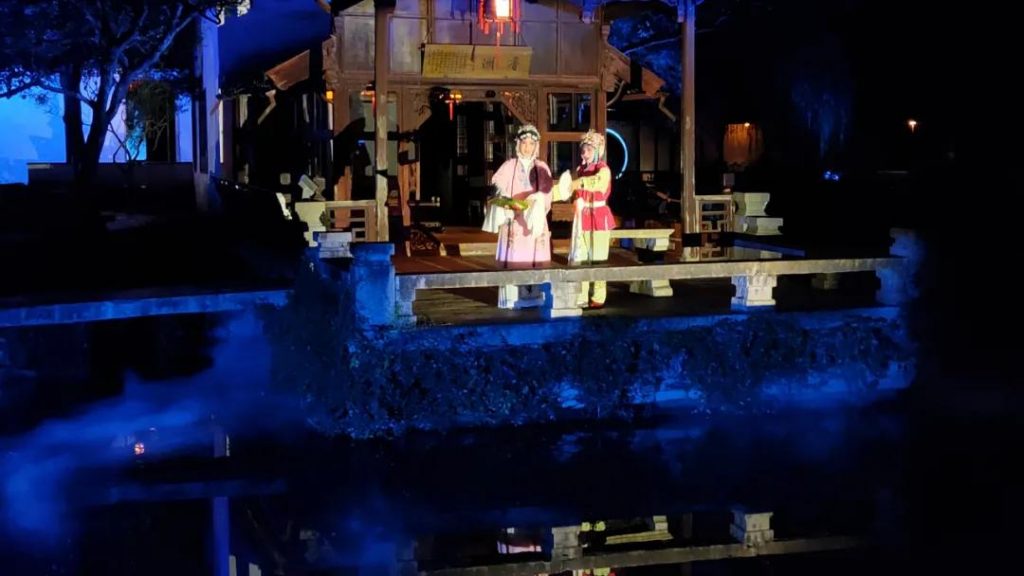 夜游路線以月相十景為線路,融入昆曲《游園驚夢》,帶給游客“視、聽、味、觸、聞”的沉浸式體驗(yàn),有拙政園與明四家李宅八景的詩情畫意;也有在光影技術(shù)不一樣面貌的“心園十二景”,也少不了霓裳舞一曲的吳韻昆曲,更有將夜游推向高潮的光影秀展,