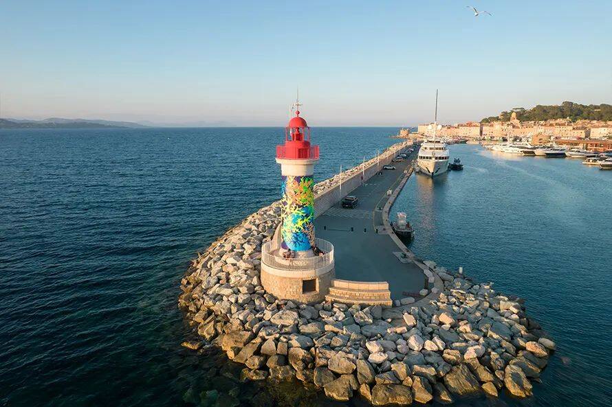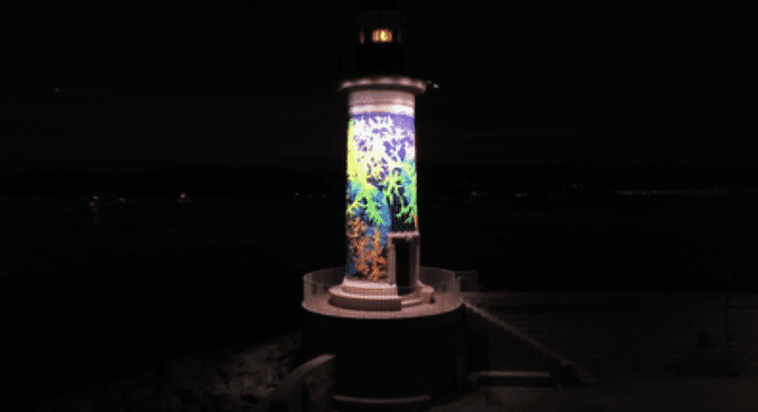 珊瑚作為深海中一道亮麗的風景線,不僅是重要的海洋生態系統,也對海洋生態起到重要作用,而Coraux Fractal 1 藝術裝置則是將深海處的珊瑚群帶到了圣特羅佩燈身上,整個塔身用熒光染料包裹住,到了夜晚用紫外霓虹燈照亮熒光染料喚醒刪除群,這不是簡單的投射,原理和海洋深處發光的生物類似,生物發光是生物體產生和發射光,深藍色的背景下,巨大的珊瑚枝重疊在一起,讓人沉浸式其中就好像真的在深海觀看珊瑚一樣。