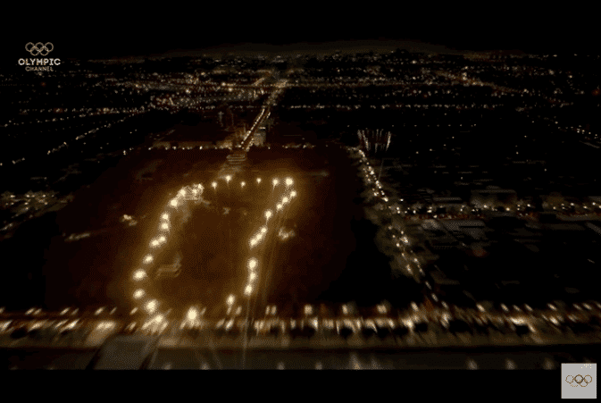 首先是《擊鼓而歌》,千樂手之勢恢弘之勢震撼人心,然后伴隨著一聲巨響,一只巨大的火焰腳印從永定門,一步步走到鳥巢上空,當最后一個腳印到達鳥巢上空的時候化作了漫天的“繁星”,繁星又匯聚成一圈閃亮的星耀五環,充滿了中國人獨有的夢幻與浪漫。