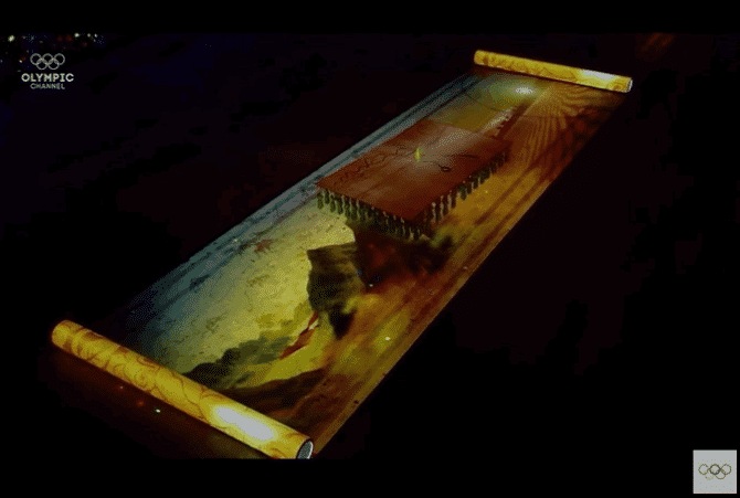 晚會分為上下兩篇,上篇《燦爛文明》,向世界呈現中國的古老文明,一卷巨大的卷軸從中間向兩邊展開,中國歷史上最著名的五幅長卷《游春圖》、《清明上河圖》、《大駕鹵簿圖》、《明憲宗元宵行樂圖》《乾隆御制萬壽圖》一一展現出來。在畫卷中間,舞者以自身為筆墨,在20米,寬11米的畫紙上作畫,一幅旭日東升的水墨圖就此完成,隨后向世界呈現的是我國的“活字印刷術”千名舞蹈演員用船槳演繹的鄭和下西洋。