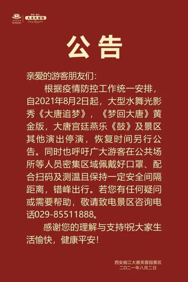 西安大唐芙蓉園:根據疫情防控工作統一安排,自2021年8月2日起,大型水舞光影秀《大唐追夢》,《夢回大唐》 黃金版,大唐宮廷燕樂《鼓》及景區其他演出停演,恢復時間另行公告。