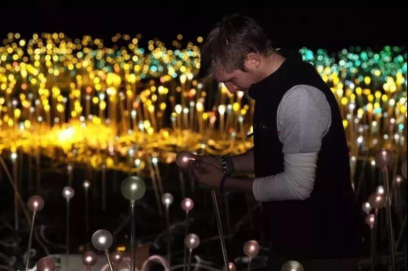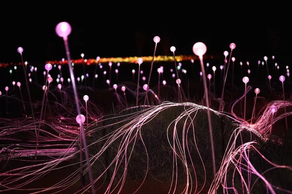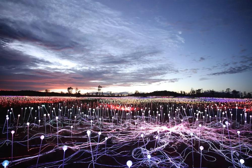 英國燈光藝術家Bruce Munro帶未婚妻去澳大利亞嗚嚕嚕旅行中,面對著神秘的烏魯魯巨石,未婚妻突然對他說“你能為我摘下天上的星星么?” 沒想到的是他竟然答應了。他在這片荒野之中挑選了一處尚好的區域,花費了半個月的時間通過數字多媒體布置了5000多盞圣誕燈的燈光藝術裝置。