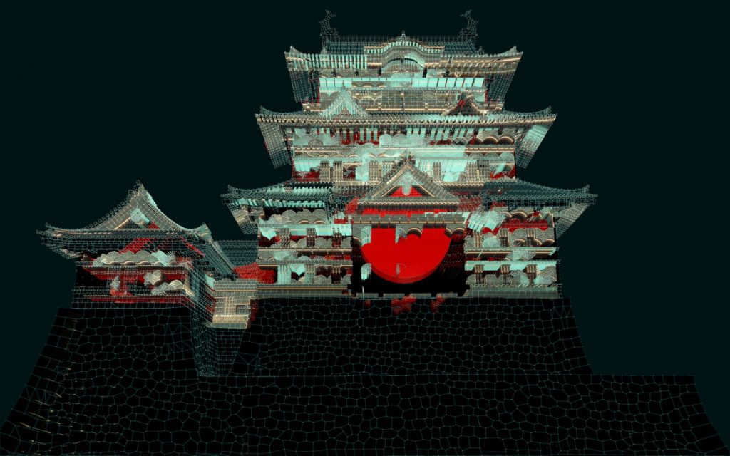 此外Yann Nguema19年還在日本的小田原城創作了建筑投影,作品以日本國旗為靈感,融合了大量傳統和現代的圖形在投影中,一分鐘的投影內容展現出了小田原城500 多年的歷史文明,其中一圈圈的漣漪仿佛像櫻花般凋落和重生,以此表達這座百年建筑生生不息的精神。