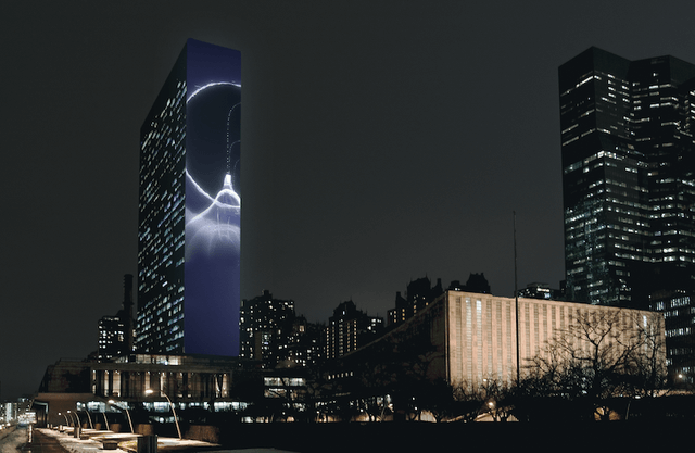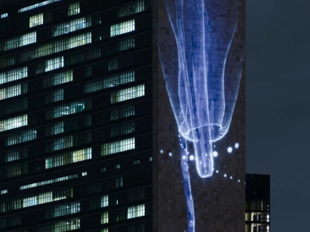 9月21日至24日來自丹麥的藝術(shù)小組SUPERFLEX,在聯(lián)合國(guó)總部大樓外立面上播放視頻投影《垂直遷移》(Vertical Migration,2021),把海洋中的管水母搬到了空中閣樓,這段20分鐘的視頻以145米高的投影形式出現(xiàn)在建筑北面的玻璃幕墻上,通過循環(huán)播放,呼吁人們關(guān)注氣候問題。