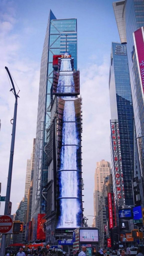 美國紐約市時代廣場被稱為“世界的十字路口”,這里匯聚了近40家商場和劇院,大量耀眼的霓虹光管廣告、以及電視式的宣傳版,高樓林立上百多塊戶外屏幕組成高樓的外壁,最近韓國的數(shù)字媒體藝術(shù)團隊d’strict旗下的團隊a’strict在紐約時代廣場帶來了最新裸眼3D作品:《Waterfall – NYC》。
