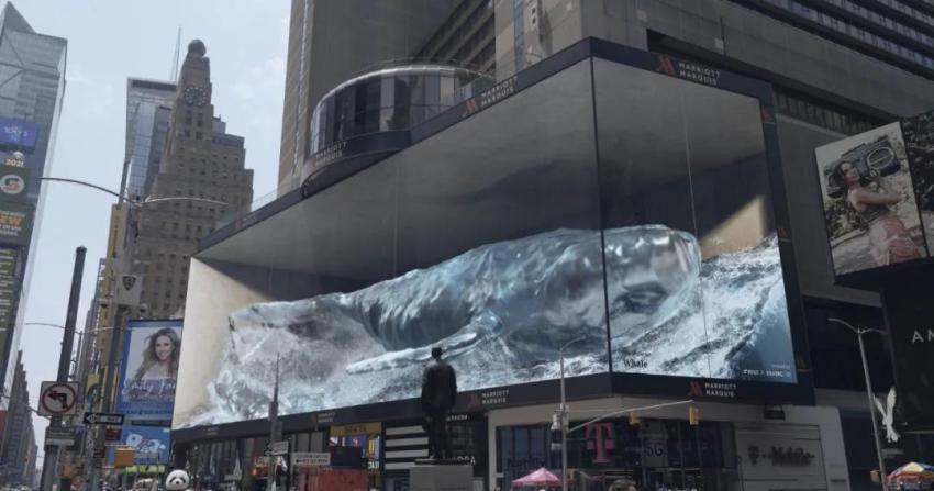 此外在紐約時代廣場萬豪酒店外的大屏幕上,a’strict團隊的另一個作品《Whale #2》也值得一提,該作品延續(xù)了d’strict的作品Wave的風格,以海浪奔涌直擊觀眾的視覺,這件作品占據(jù)了萬豪酒店外立面1400平方米的大屏幕空間,翻滾的海浪一下一下的沖擊著,忽然一頭藍鯨從海浪中躍出,本就不翻涌的海水瞬間愈發(fā)洶涌,急速的拍打、沖擊著,好似下一秒就要涌出屏幕一頃而下,這頭藍鯨就在紐約時代廣場掀起了巨大的海浪。