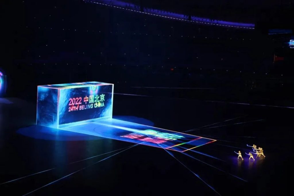 奧運(yùn)五環(huán)的呈現(xiàn),一直是最能體現(xiàn)開(kāi)幕式的構(gòu)思與靈感的,本次開(kāi)幕式由一個(gè)冰球撞向“冰立方”,冰立方逐漸破碎為開(kāi)始,隨即往屆23屆冬奧舉辦城市的歷史隨著環(huán)繞全場(chǎng)的24道“激光刻刀”的雕琢閃回其上,隨即,一個(gè)晶瑩剔透的冰五環(huán)從冰立方當(dāng)中破繭而出。據(jù)了解,該冰立方總重量有400噸,升降重量達(dá)180噸,利用特效的光影實(shí)現(xiàn)破冰而出的效果。