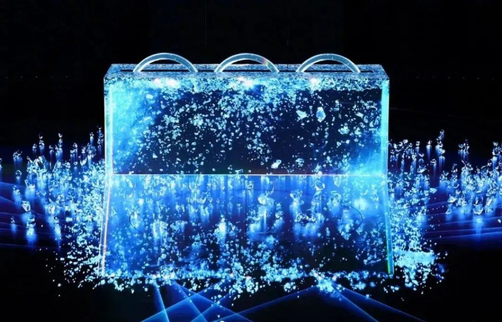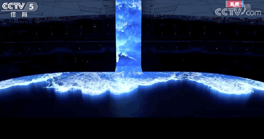 這是一塊將近60米高、20米寬的LED屏,這塊屏幕傾刻間化身為一道連接天地的藍(lán)色瀑布,當(dāng)一滴冰藍(lán)色的水墨從天而降,又瞬間化開(kāi)變?yōu)辄S河之水,傾瀉而下,整個(gè)場(chǎng)地波濤翻滾,讓人不禁想到李白的“黃河之水天上來(lái),奔流到海不復(fù)回”讓全世界看到我們的文化底蘊(yùn),翻涌的海浪最終流動(dòng)并凝結(jié)為一塊冰立方:2022中國(guó)北京。