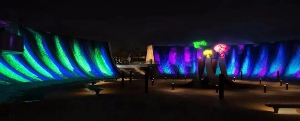 夜晚降臨,這座藝術(shù)裝置引入燈光設(shè)計,結(jié)合音樂旋律,打造出一種多感官沉浸式體驗(yàn)。人們聚集在瀑布周圍,感受四處飛濺的水珠。