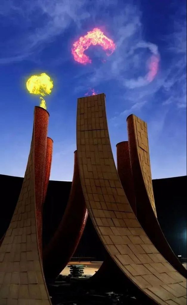 水墻以三個入口切入這座火山般的結(jié)構(gòu),形成了入口和三個觀景臺,游客至此可以俯瞰競技場和壯麗的景色;而夜間還有火焰與燈光的別樣演繹。