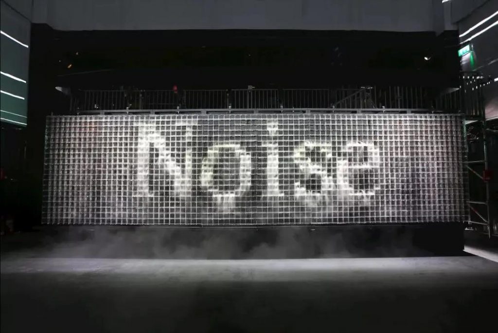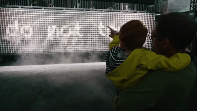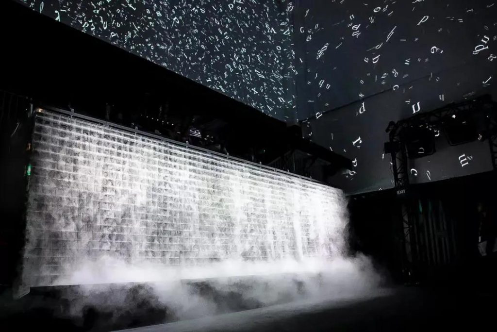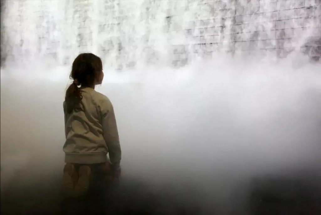 這些詞句出現(xiàn),消失,再出現(xiàn)……形成一個回味無窮的語言展示區(qū)。如果無人參與互動,該作品看起來就只是一片由水蒸汽組成的云端“瀑布”。