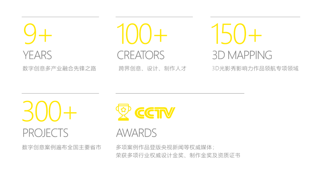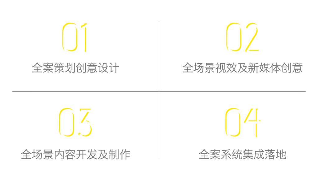團隊以數字文化創意賦能文旅夜游、文旅商綜合、主題游樂、地標光影秀、劇秀演藝,等多元產業,為諸多國事及市政活動、景區景點與城市文旅等,提供集合全案策劃創意設計、全場景視覺設計及新媒體設計、全場景內容開發研發及制作、全案系統集成落地,等數字創意服務。