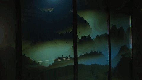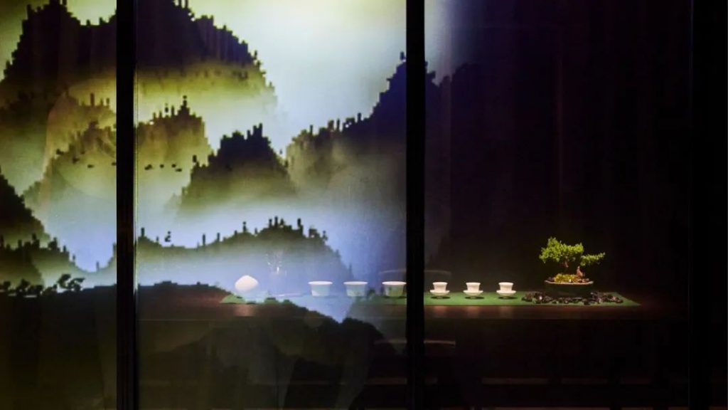 水墨形式的靈感來自亞洲的茶文化傳統(tǒng),當(dāng)游客在這個空間內(nèi)移動時,交互式屏幕會對游客動作做出反應(yīng),朦朧煙霧慢慢消散,遠(yuǎn)處的山景逐漸顯現(xiàn)。