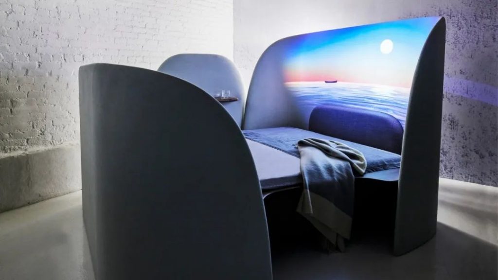 投射在床尾的影像從大自然中汲取靈感,平緩的丘陵,綿延的峻嶺,以及無波的湖水……環(huán)繞式音箱播放的自然之聲,像繭一樣包裹著游客,游客能從心感受重?fù)?dān)從肩頭卸下的輕松感,達到身心健康的療愈。