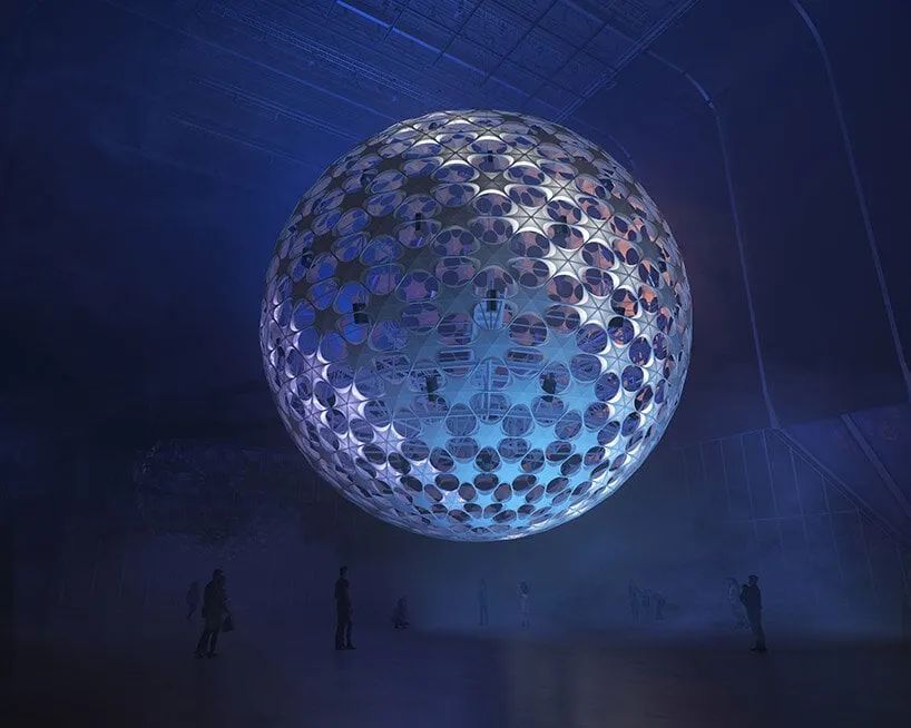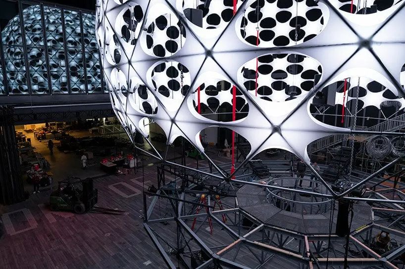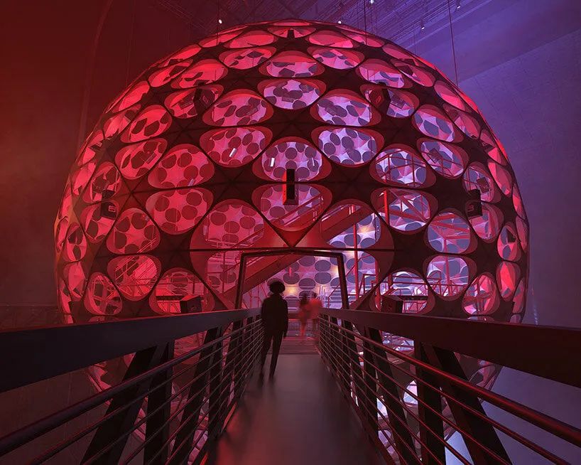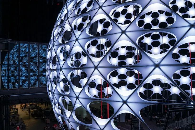 在球體內(nèi)部,250名觀眾將聚集在特別設(shè)計的聆聽平臺上,該平臺高出地面34 英尺,圍繞著中央網(wǎng)絡(luò)。“空間化音景”由一百多個揚聲器組成,這些揚聲器將聲音在人們的身體上方、下方穿過和移動,球體表面的動態(tài)照明讓這場超真實的多感官之旅更加動感、炫酷。