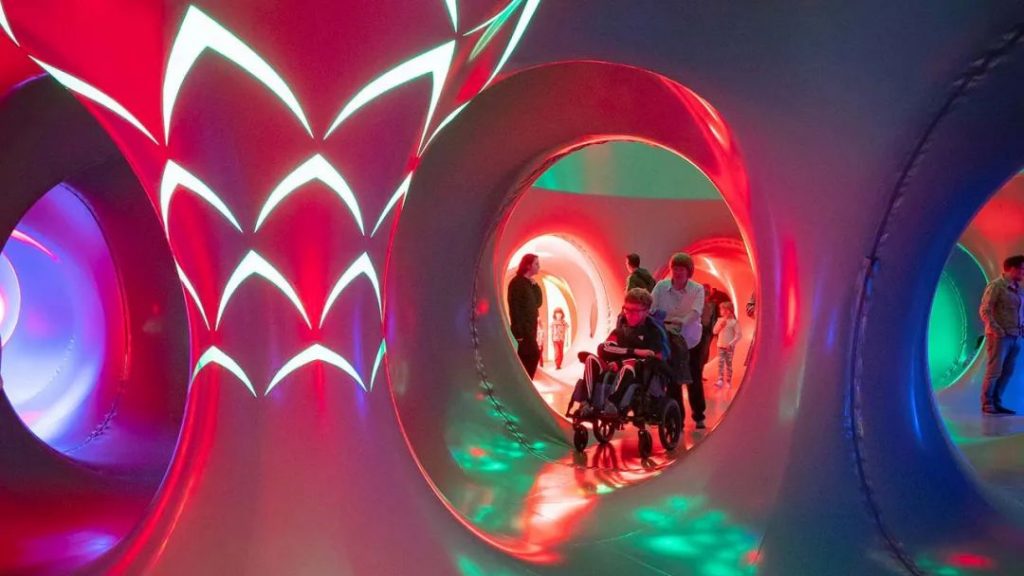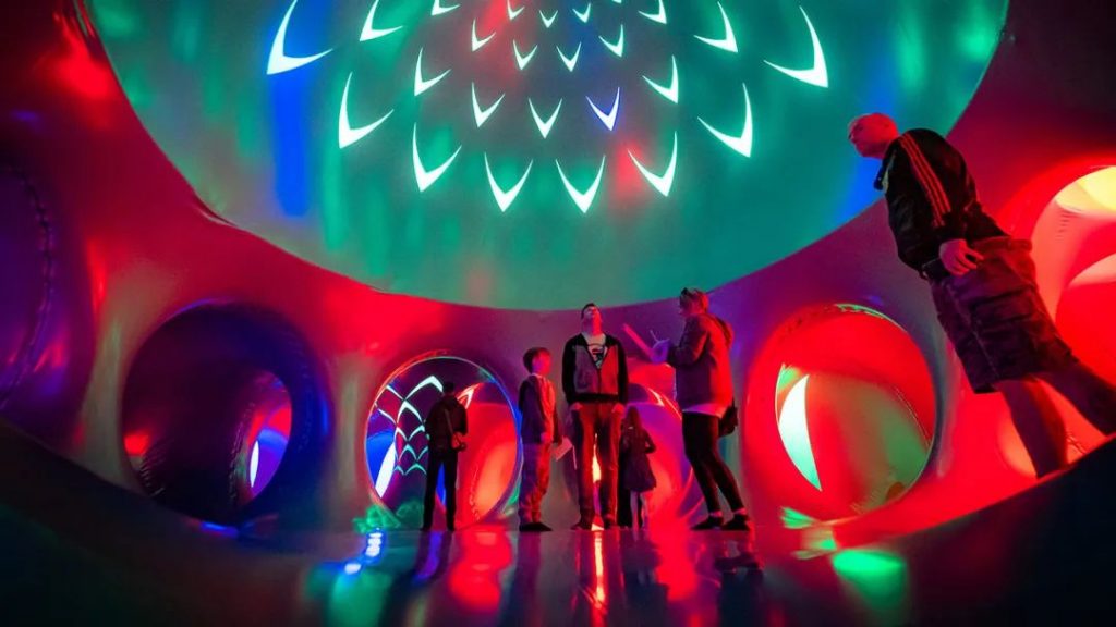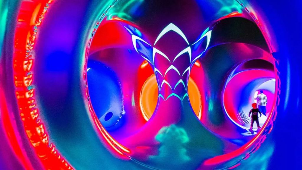 這個充滿活力的裝置構成了一個發光的充氣結構,一半是跳躍的城堡,一半是迷宮。躲在色彩繽紛的柱子后面,坐在飽和的氣泡狀口袋中,躺下來時,可以凝視曼陀羅般的天花板。