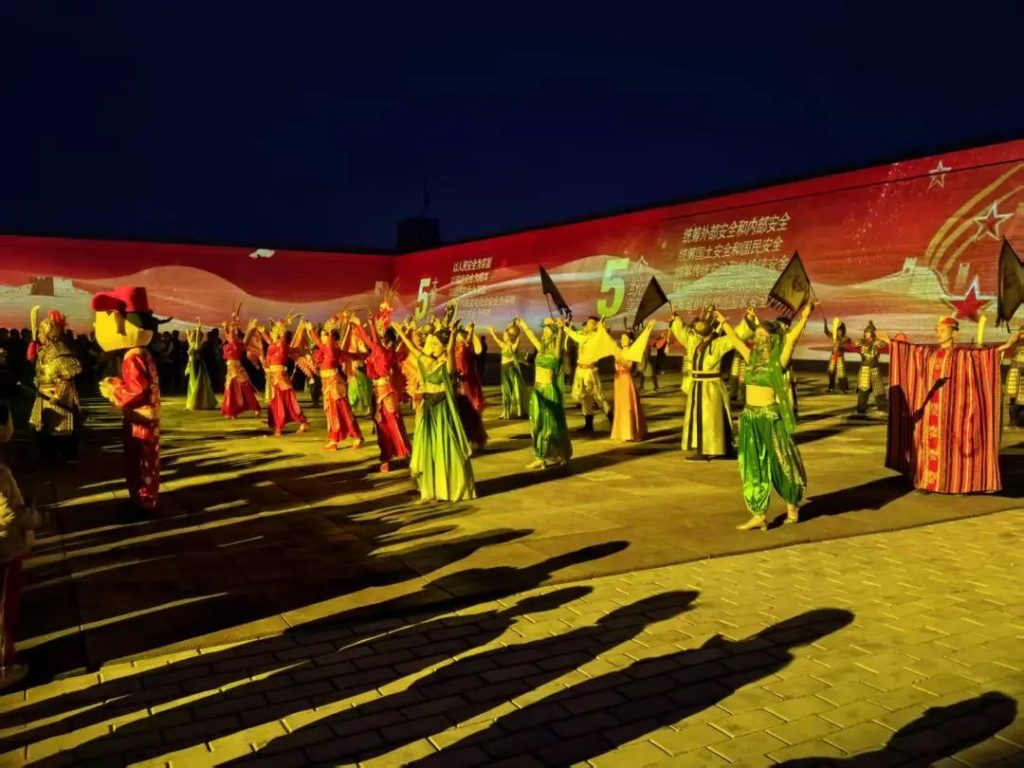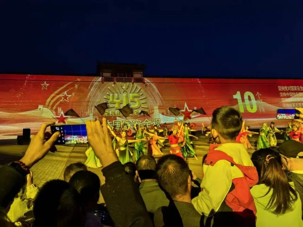 關城古建筑巍峨的城墻化作光影幕布,重現漢代將士戍邊的壯烈場景。城墻上的烽火狼煙與現代光影技術交融,“全民國家安全教育 走深走實十周年”“國家安全是民族復興的根基,社會穩定是國家強盛的前提”“國家安全是中國式現代化行穩致遠的重要基礎”“守護國家安全的鋼鐵長城”“國家安全 ?人人有責”等醒目標語,將古代戍邊精神與總體國家安全觀深度融合。