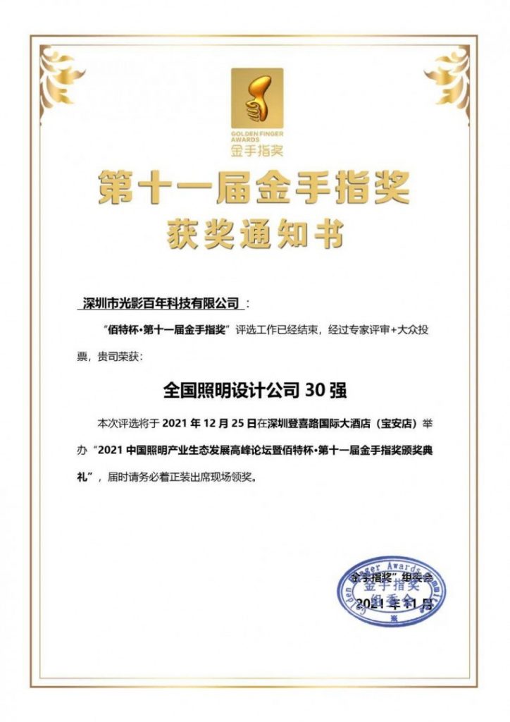 此次光影百年在專業(yè)終審評委組的推薦下,榮幸入選并通過公示獲得“全國照明設(shè)計公司30強”獎項。